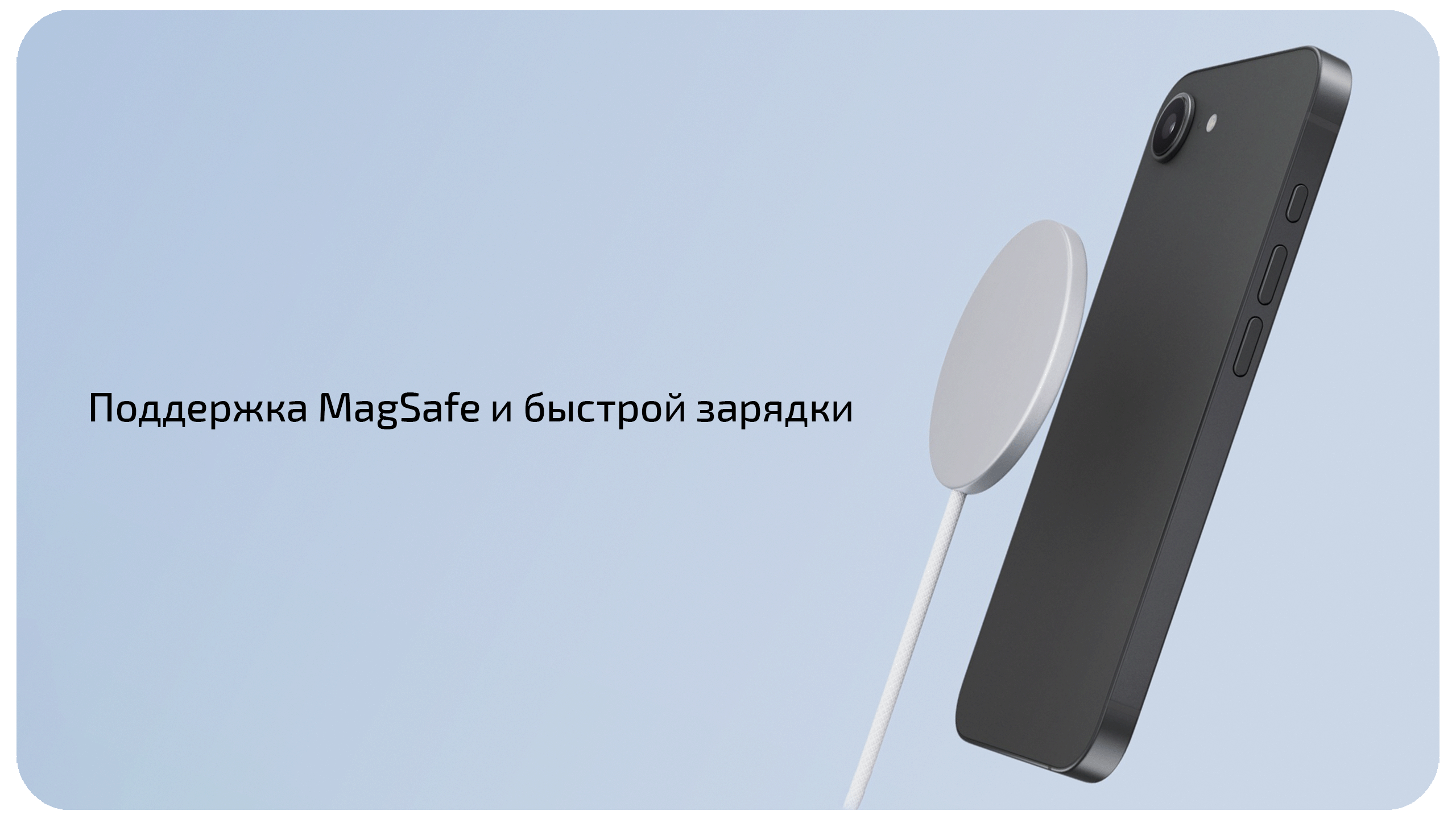 Чехол с магнитами больше не обязательное условие для использования картхолдеров, держателей и других аксессуаров MagSafe. А ещё скорость беспроводной зарядки стала выше, а при подключении зарядных устройств с MagSafe на экране будет соответствующая анимация. Помимо этого iPhone 17e оснащён разъёмом USB-C для зарядки и передачи данных. При использовании адаптера питания мощностью 20 Вт смартфон способен зарядиться примерно до половины всего за полчаса. В комплект входит кабель USB-C в износостойкой оплётке. Ёмкий аккумулятор обеспечивает до 26 часов в режиме воспроизведения видео.