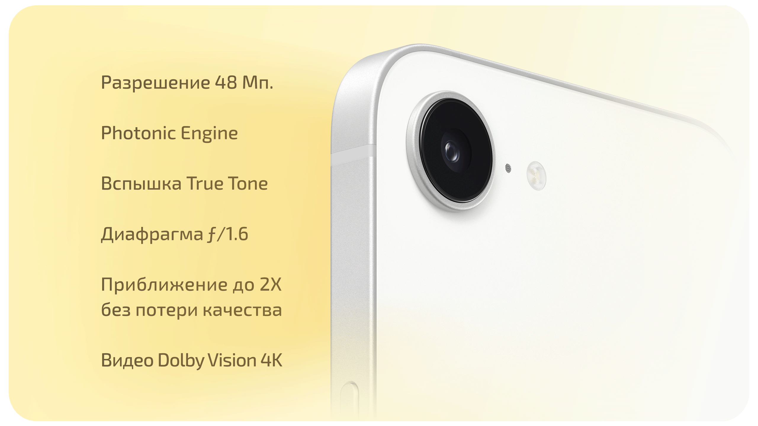 Основная камера iPhone 17e получила 48-мегапиксельный сенсор и поддерживает двукратное приближение с качеством оптического уровня. Модуль основной камеры при этом один, аналогичное решение Apple уже предлагала чуть раньше в iPhone Air. Улучшенные алгоритмы обработки изображений помогают сохранять максимум деталей при съёмке в любых условиях. Камера поддерживает ключевые функции, знакомые пользователям iPhone: ночной режим, портретную съёмку, фотографические стили и Smart HDR. Для селфи используется фронтальная камера с автофокусом. В отличие от других моделей 17-й серии и уже упомянутого iPhone Air, сенсор в ней не квадратный, а такой же как в iPhone 16e.