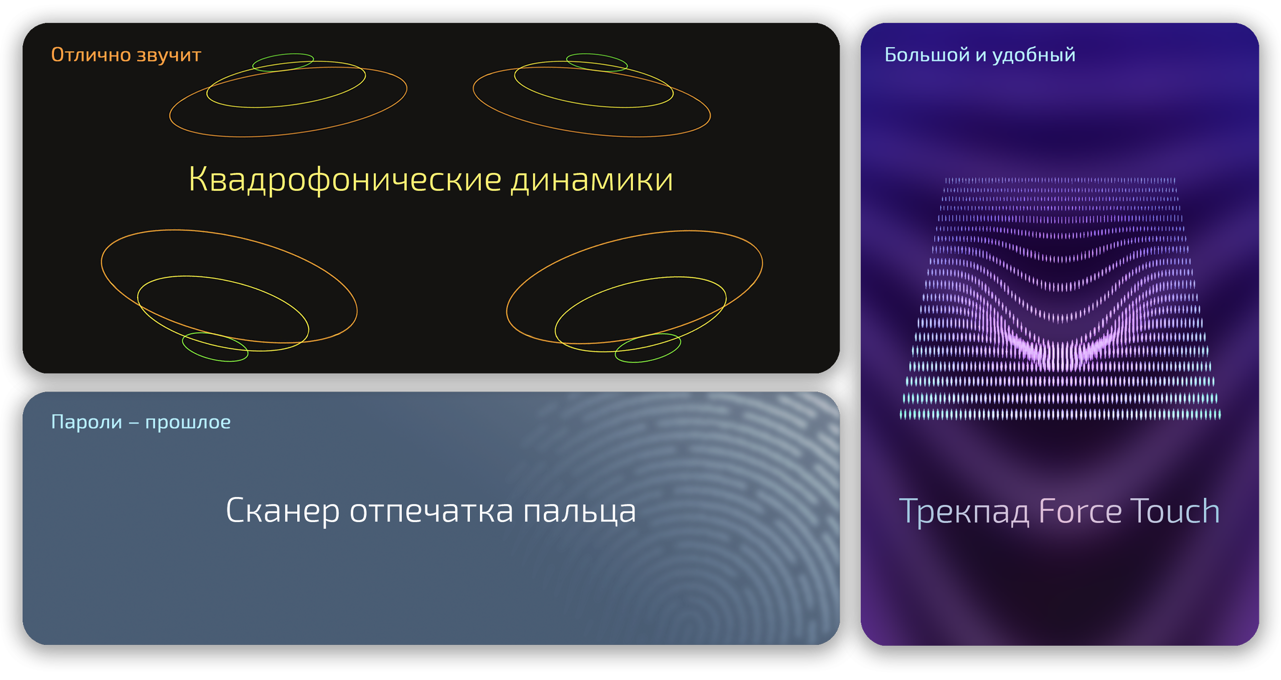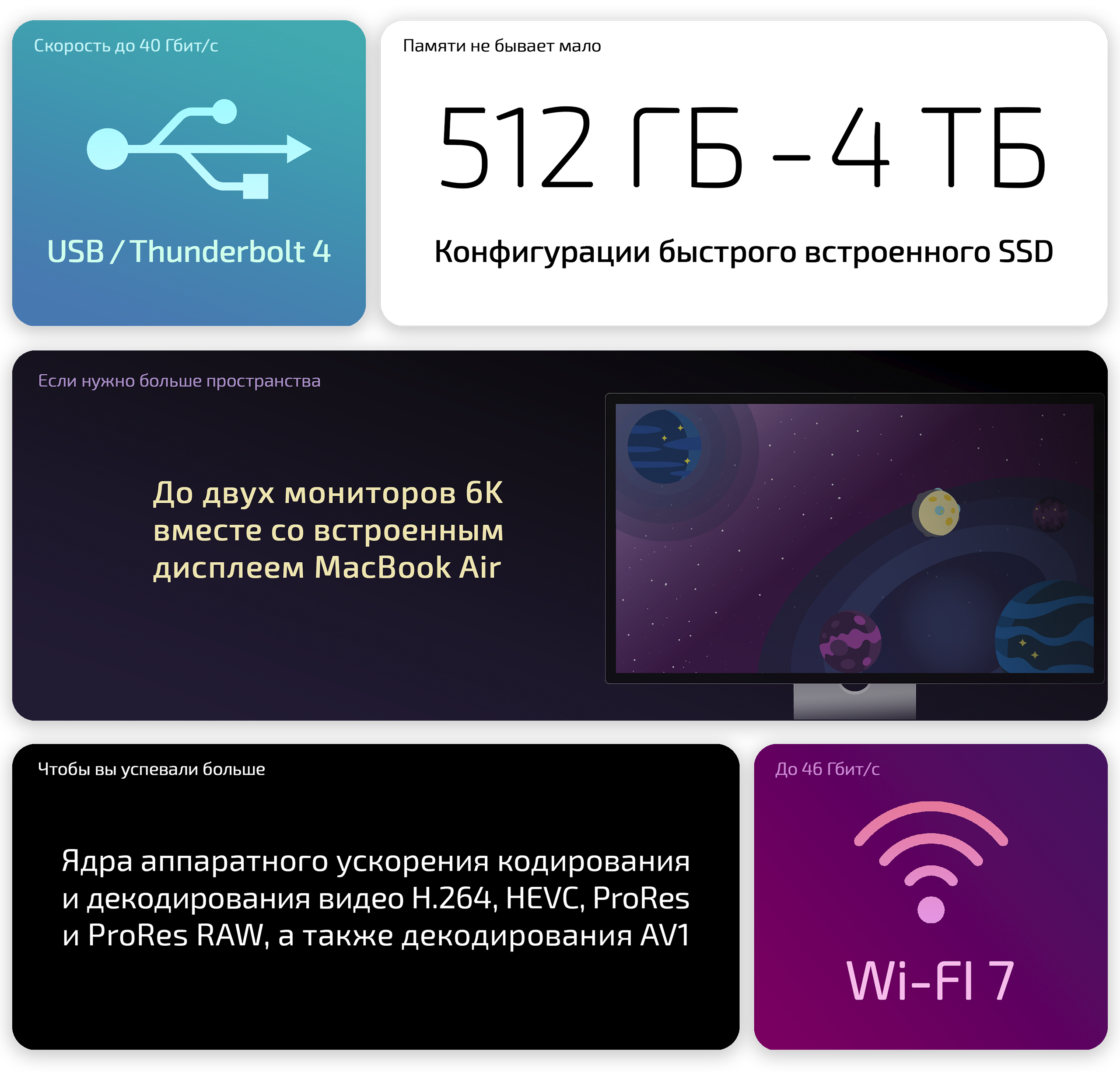 Хочется подключить большой монитор? Легко, хоть два сразу, причём в разрешении до 6K с частотой 60 Гц или 4K с частотой до 144 Гц. А если подключить один монитор, то доступны следующие параметры: 8K или 6K – до 60 Гц, 5K – до 120 Гц, 4K – до 240 Гц. Два USB-C 4 c поддержкой Thunderbolt 4 и скоростью передачи данных до 40 Гбит/с позволяют подключать быстрые внешние накопители, а для дисплеев поддерживается стандарт DisplayPort 1.4 с HBR3 и DSC. Беспроводные стандарты в моделях 2026 года тоже прокачались: Wi-Fi 7 и Bluetooth 6.