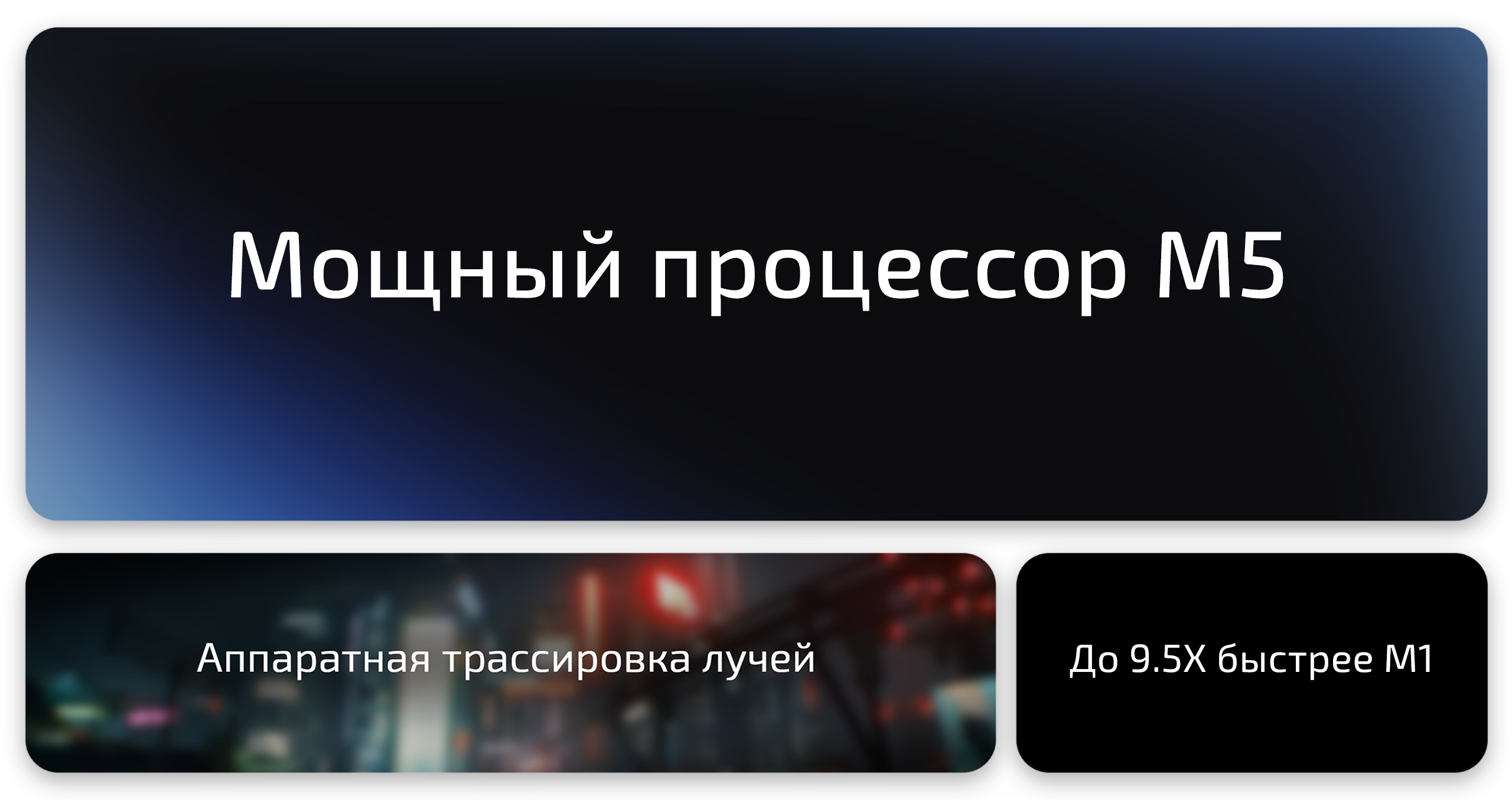 Процессор M5 значительно превосходит предыдущие чипы Apple, а прирост ощущается даже в сравнении с M4. В отдельных задачах, связанных с нейросетями, M5 обгоняет своего предшественника в четыре раза и почти в 10 раз превосходит M1. Процессор получил 10 ядер, мощную графику с аппаратным ускорением трассировки лучей, а пропускная способность объединённой памяти составляет 153 ГБ/с. Кстати, оперативная память в чипах Apple называется объединённой, потому что также используется как видеопамять и для ускорителей машинного обучения. Как и прежде, ноутбук справляется без активного охлаждения, поэтому работает совершенно бесшумно.