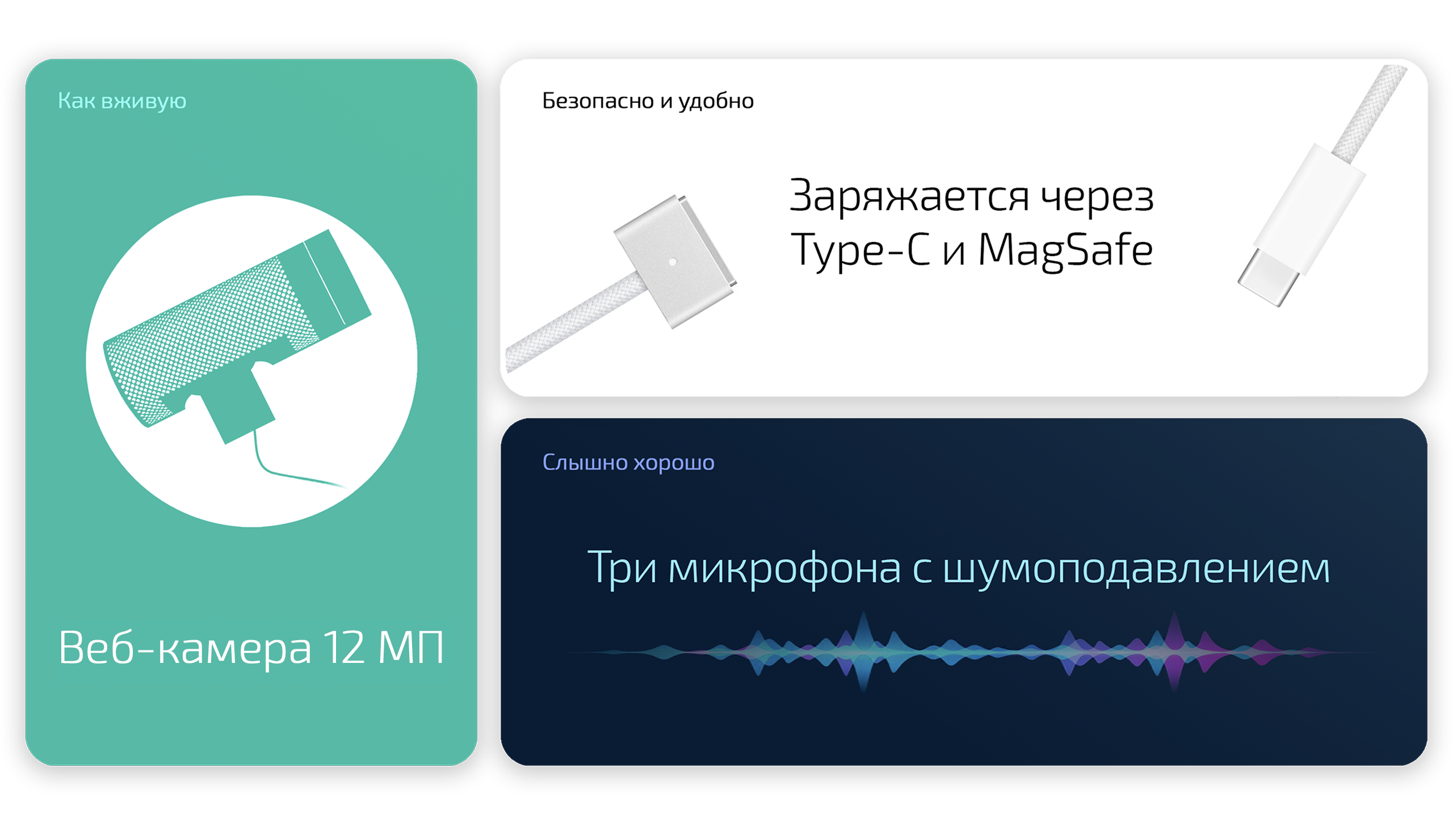 Система из четырёх динамиков обеспечивает качественный звук, которого не ожидаешь от столь компактного ноутбука. Они поддерживают Dolby Atmos, а при подключении AirPods доступно пространственное аудио с отслеживанием положения головы (если сами наушники имеют данную функцию). Для проводных наушников предусмотрен разъём 3,5 мм с поддержкой высокого импеданса. Ну а для разговоров подключать что-либо и вовсе не обязательно: все MacBook Air на базе M5 имеют три микрофона с функцией изоляции голоса.