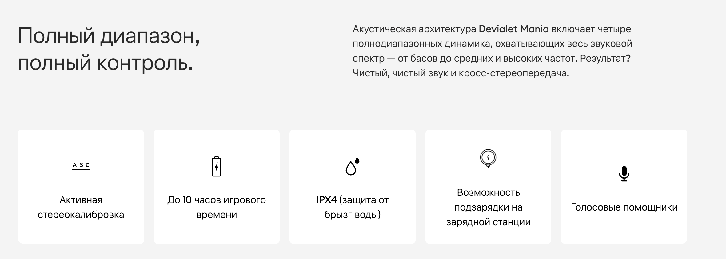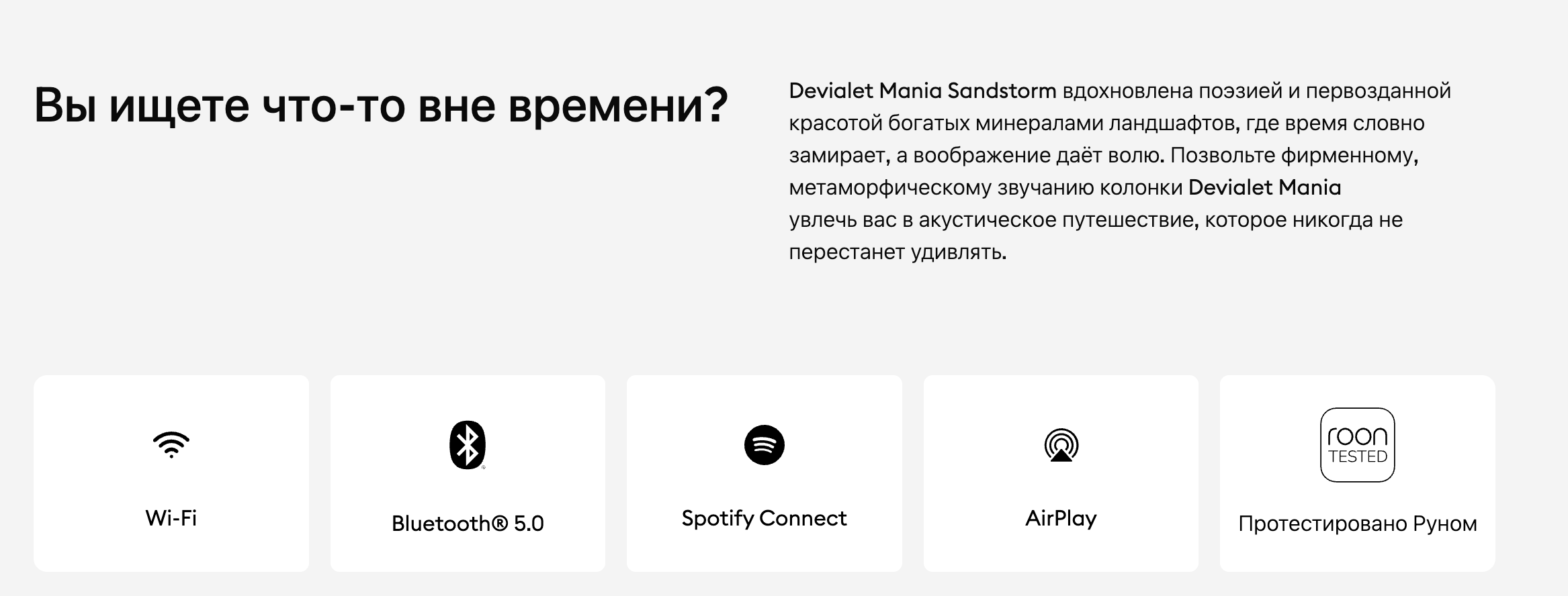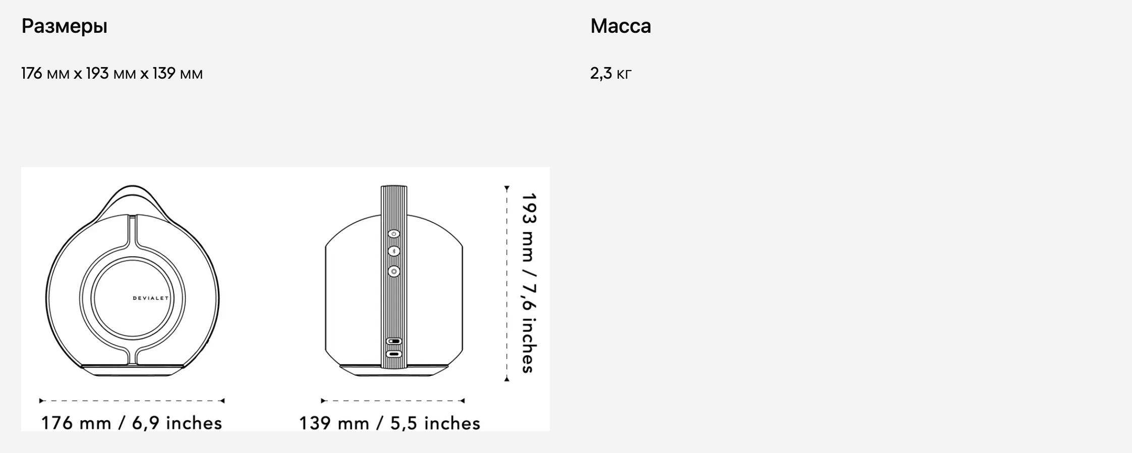 1x Девиалет Мания 1x кабель питания USB-C и блок питания 1x руководство пользователя 1x сумка для колонок 1x Devialet Mania Station (беспроводная зарядная станция)