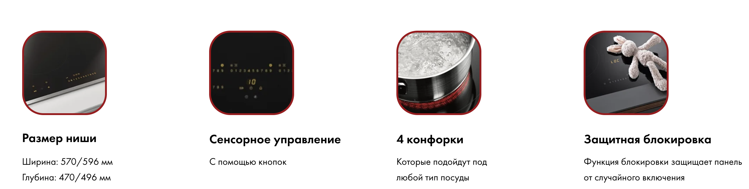Вы можете готовить сразу несколько блюд одновременно благодаря четырем варочным зонам разного диаметра. Одноконтурные оснащены одним ленточным нагревательным элементом, двухконтурные, соответственно, двумя, наличие которых позволяет использовать даже крупную посуду. Каждая конфорка имеет устройство защиты от перегрева (внутренний ограничитель температуры).