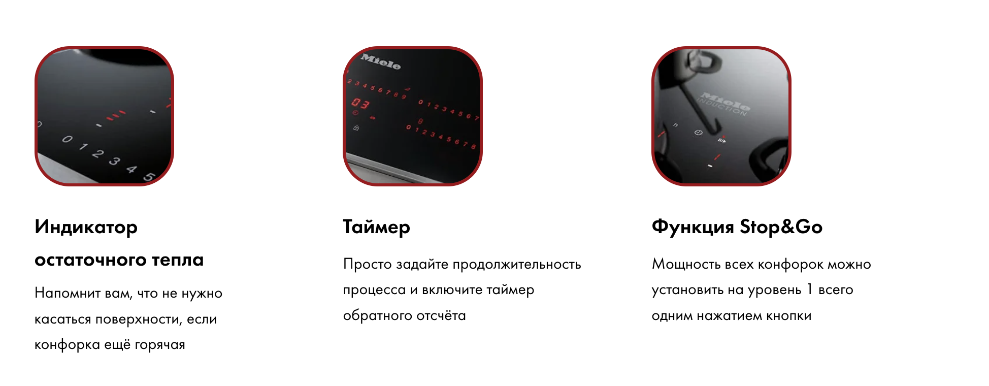 Прибор имеет большое количество автоматических программ, которые значительно облегчат процесс готовки. К примеру, автоматика закипания подключит максимальный уровень разогрева до момента кипения, а затем вернет выбранную пользователем температуру. Индикация остаточного тепла покажет, какая из конфорок еще недостаточно остыла во избежание получения ожогов, а функция паузы Stop&Go сохраняет все выбранные настройки при необходимом отключении прибора.