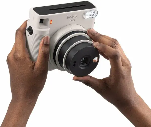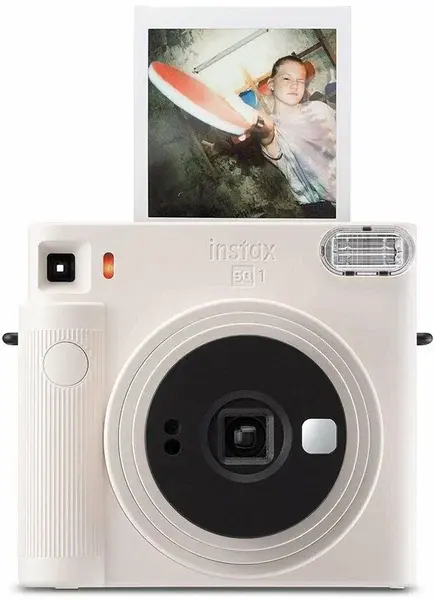 Фотокамера моментальной печати FujiFilm Instax Square SQ1 представлена в компактном белом корпусе с наручным ремешком, позволяющим избежать случайного падения устройства. Прибор оснащен видоискателем и вспышкой, действующей до 2.2 м. Время выдержки составляет 1/400-1/2 секунд.