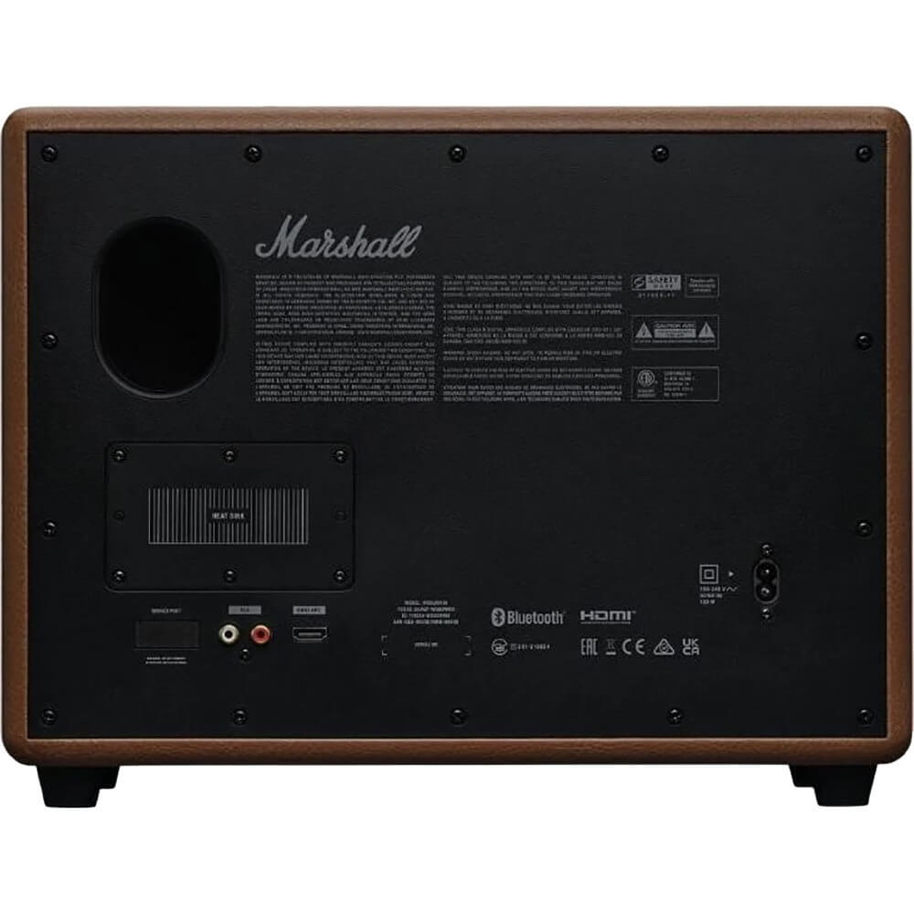 Marshall Woburn III поддерживает разнообразные варианты подключения, включая Bluetooth 5.2, RCA и даже HDMI, что позволяет использовать её вместо саундбара для вашего телевизора. Поддержка Bluetooth 5.2 LE обеспечивает стабильное беспроводное соединение на расстоянии до 10 метров без искажений и помех.