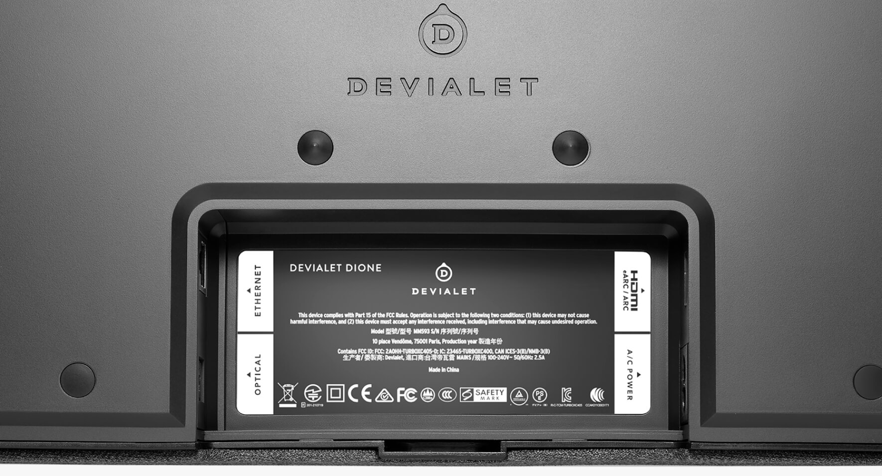 Саундбар Devialet Dione оснащён современным портом HDMI 2.1 eARC (Enhanced Audio Return Channel)/ARC, который поддерживает самые современные аудиоформаты и обеспечивает высочайшее качество звука без потерь. Вход HDMI 2.1 eARC также поддерживает CEC (Consumer Electronics Control), что дает Вам возможность управлять вашим саундбаром и ТВ с помощью одного пульта дистанционного управления - Безграничные возможности подключения