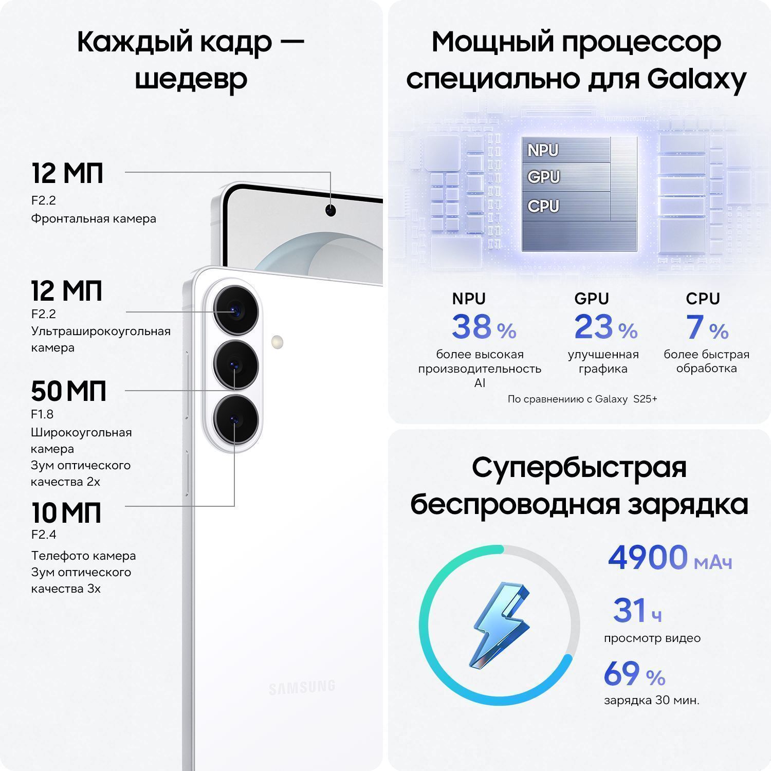 Беспроводная зарядка, Обратная беспроводная зарядка, Быстрая зарядка, Емкость аккумулятора, мАч 4900