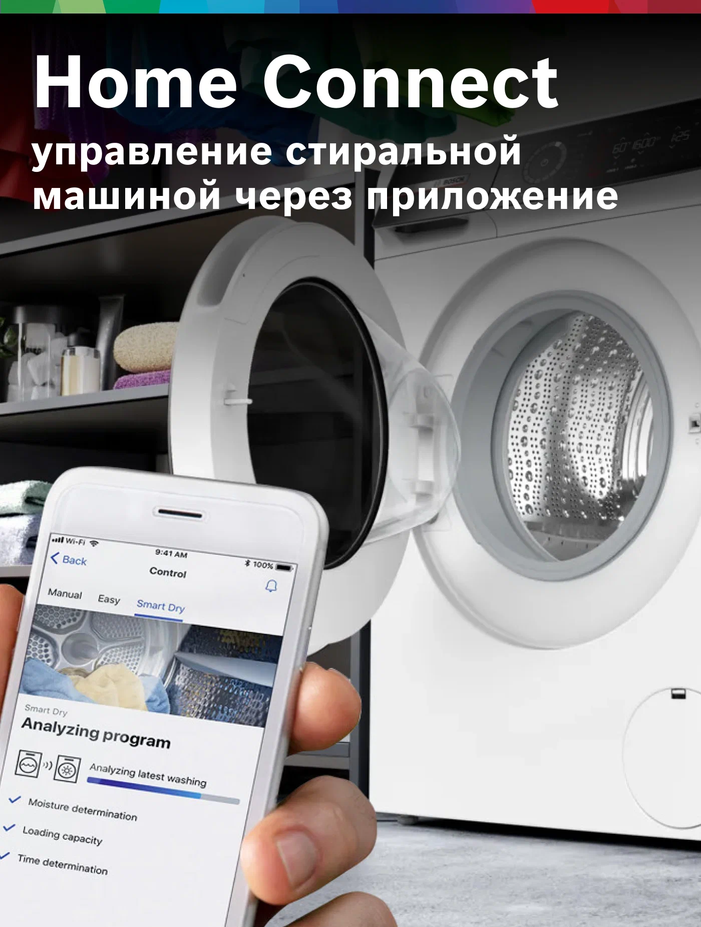 Функция Home Connect позволяет управлять стиральной машиной удаленно, контролировать энергопотребление и получать уведомления о состоянии цикла.