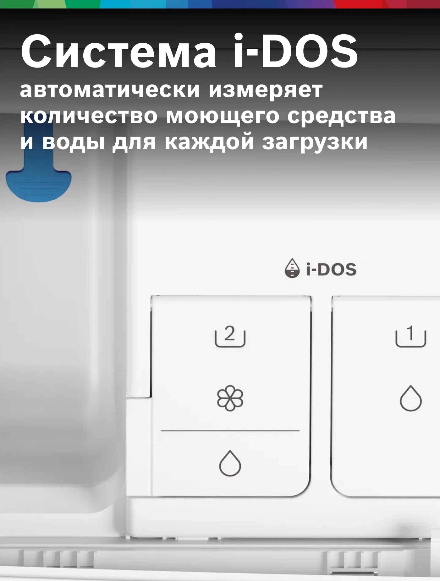 Система i-DOS автоматически отмеряет точное количество моющего средства и воды, что обеспечивает экономию ресурсов и бережное отношение к вещам.