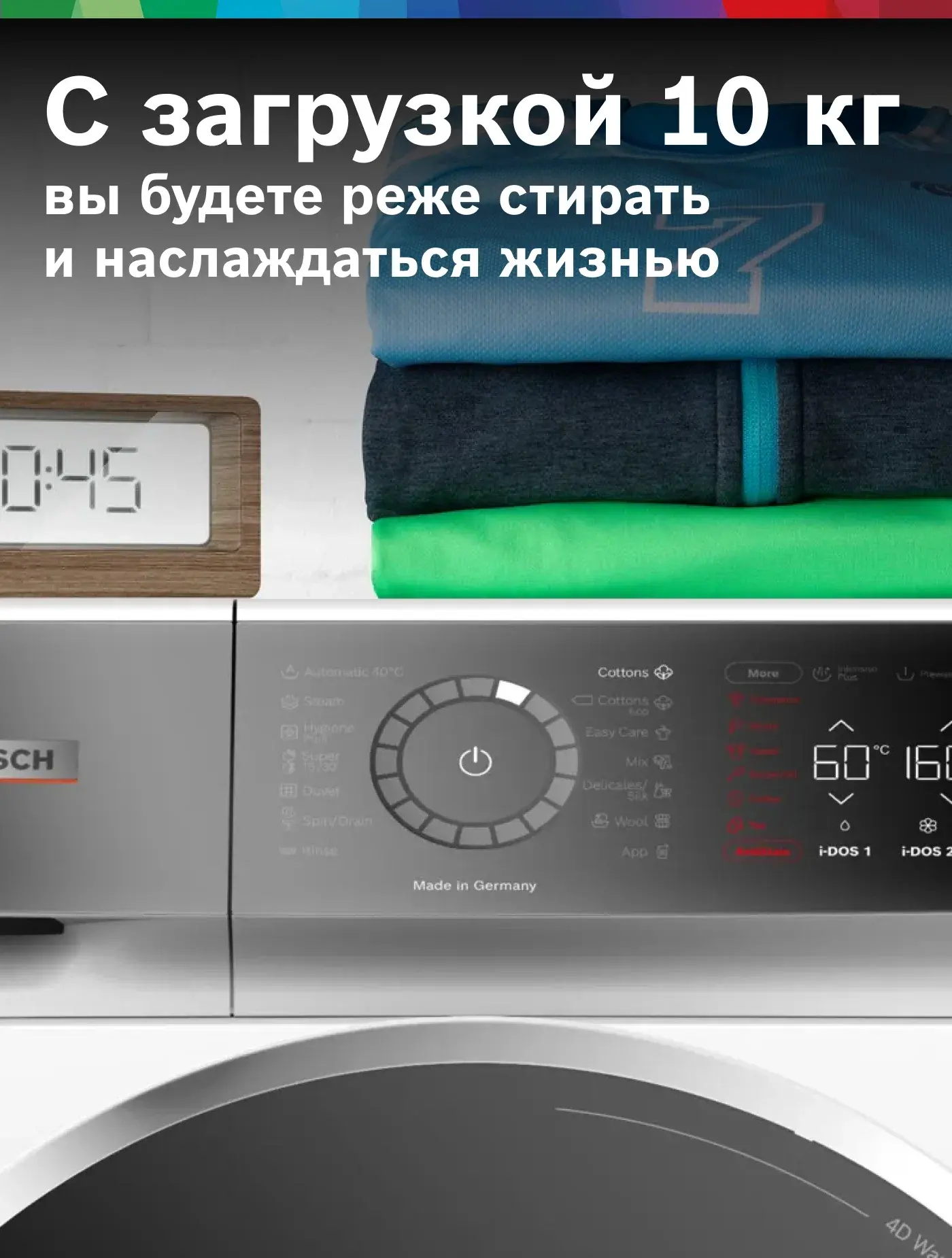 Стиральная машина Bosch WGB256A0ME Serie 8 с фронтальной загрузкой и максимальной загрузкой белья 10 кг предлагает 14 программ стирки, включая специальные программы для стирки спортивной одежды, деликатных тканей, шелка, шерсти и хлопка.