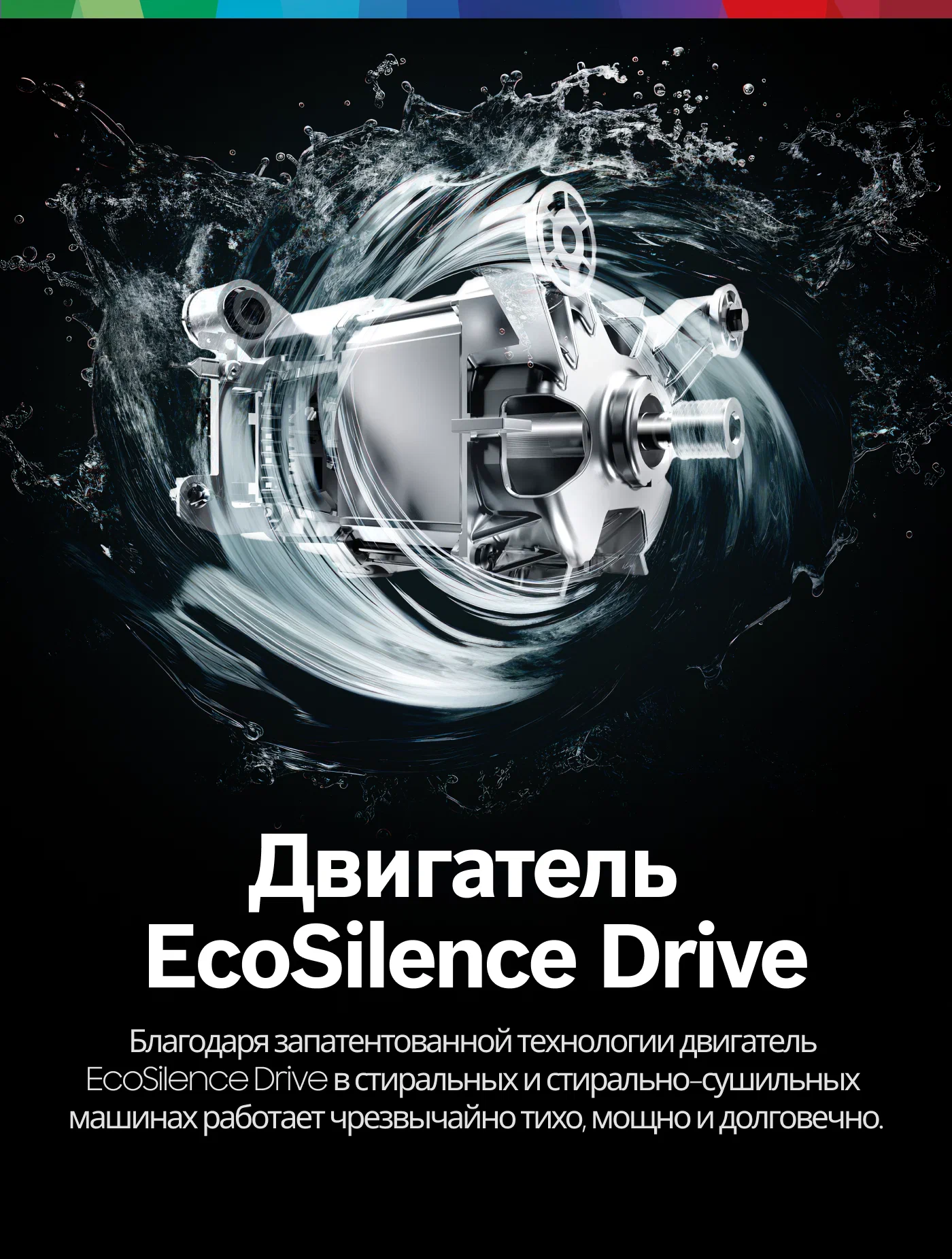 Стиральная машина оснащена электронным управлением и инверторным двигателем EcoSilence, который обеспечивает тихую работу и длительный срок службы.
