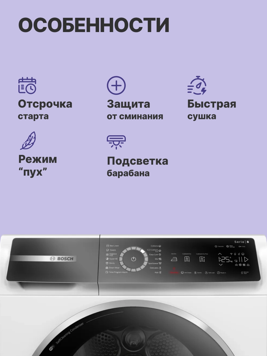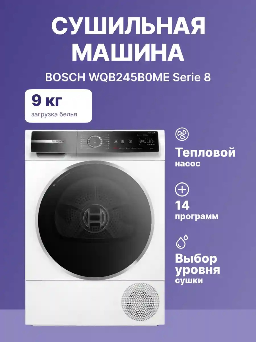 Сушильная машина Bosch WQB245B0ME Serie 8 с фронтальной загрузкой — это высокотехнологичный и надежный помощник в домашнем хозяйстве, который обеспечивает эффективное сушка белья при минимальных усилиях. С объемом загрузки в 9 кг данная модель обеспечивает высокую производительность и экономию времени на стирку и сушку.