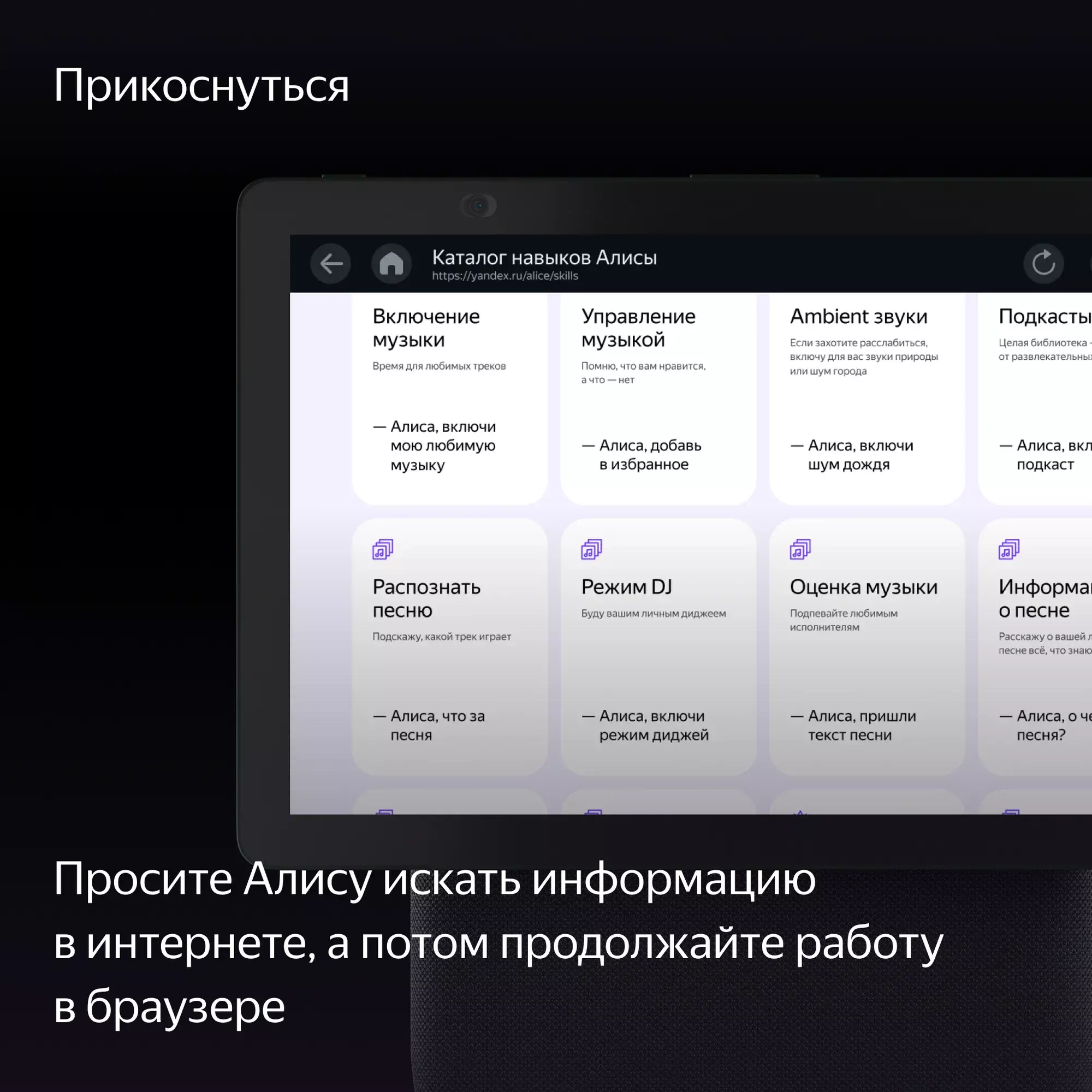 Просите Алису искать и включать музыку, фильмы или сериалы, а потом управляйте контентом на экране касаниями: перематывайте, ставьте на паузу и выбирайте нужное. Смотрите телеканалы. Задавайте Алисе вопросы — и не только слушайте её ответы, но и смотрите их на экране. Или пользуйтесь браузером.