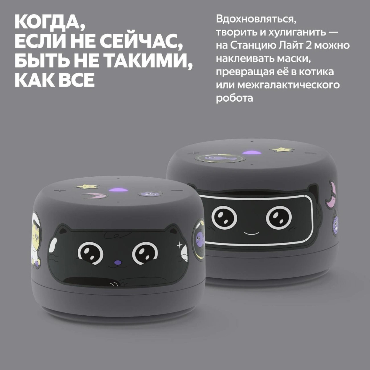 Со Станцией Лайт 2 дети могут играть, хулиганить и превращать умную колонку в необычных персонажей. Например, можно наклеить на колонку маску котика или межгалактического робота. А стикерами из набора здорово украшать и умную колонку, и всё вокруг.