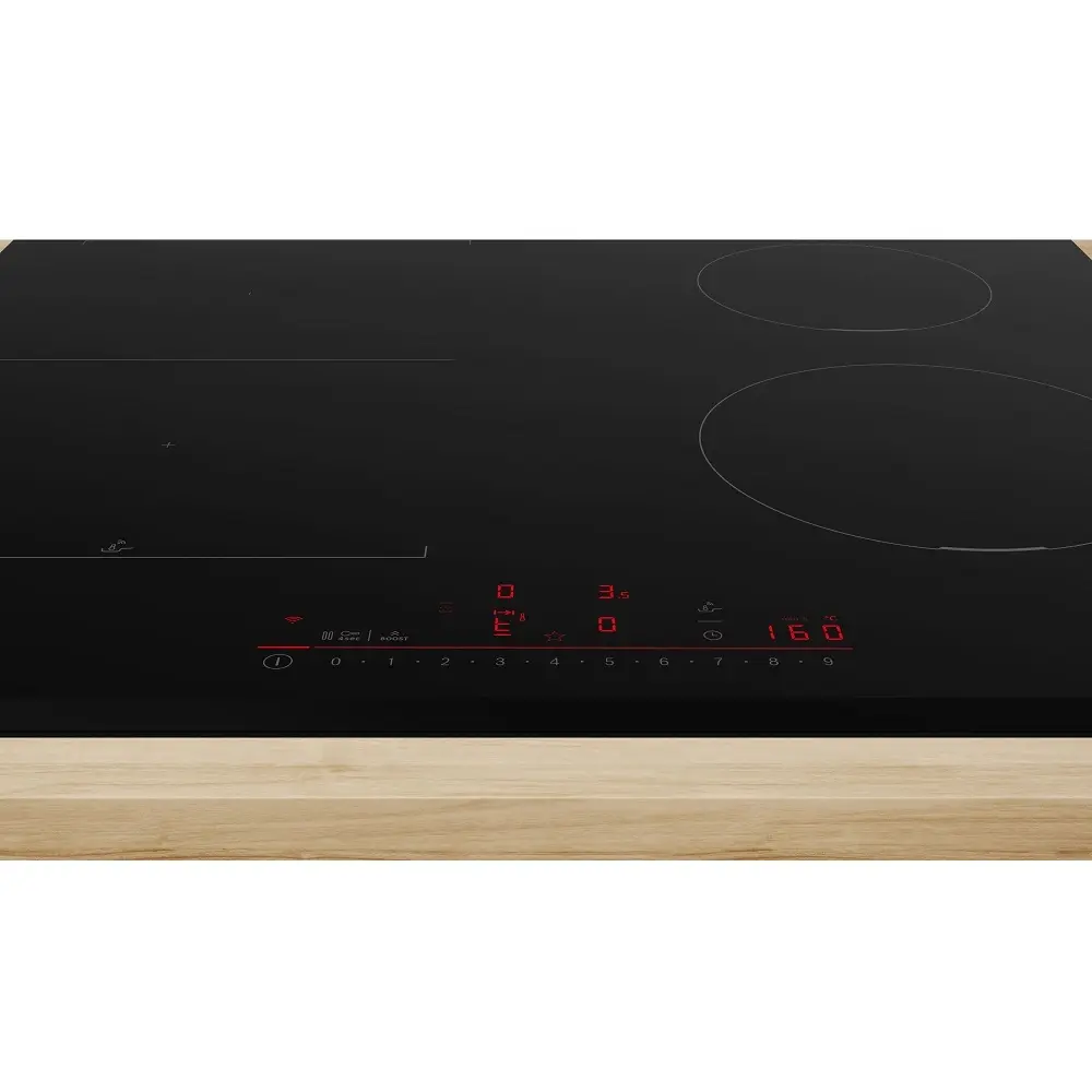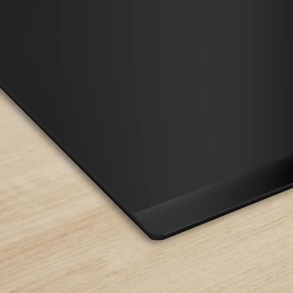 Корпус варочной панели Bosch PVS631HC1E Serie 4 выполнен из стеклокерамики черного цвета. Материал отличается высокой устойчивостью к различным повреждениям: на поверхности не появляются сколы, царапины и потертости, она легко очищается от загрязнений. Плита обладает скошенными краями.