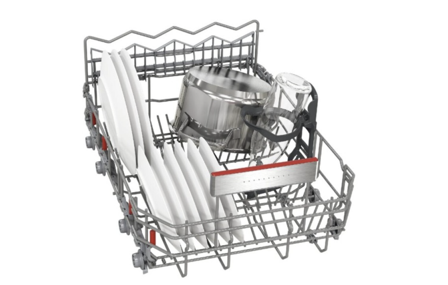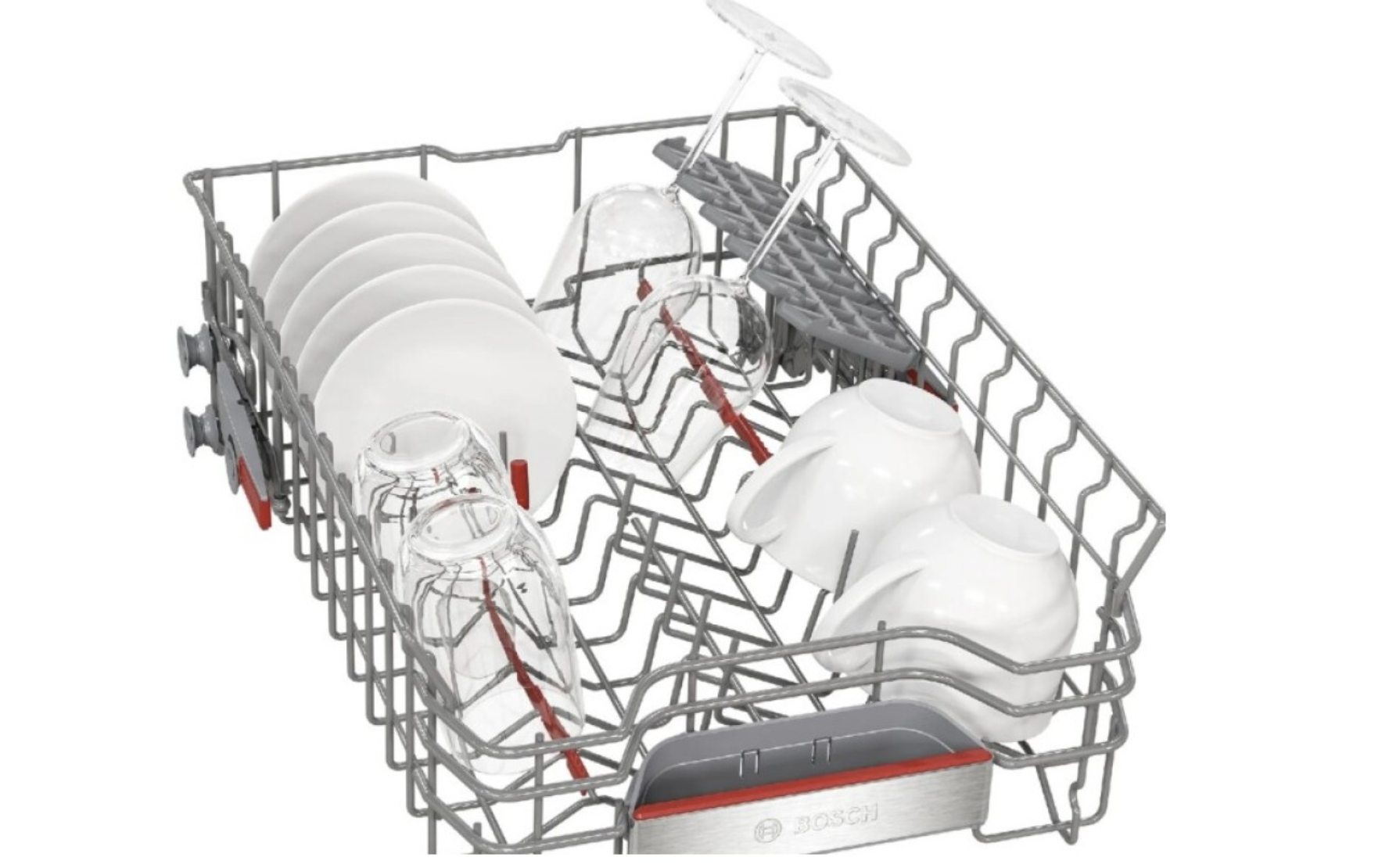 Переставляемый по высоте верхний короб с системой Rackmatic-3 Направляющие для тарелок: 4 складных, в нижнем коробе. Оборудование в верхнем коробе:2 полочки для чашек.Оборудование в нижнем коробе: дополнительный фиксатор для бокалов, 2 полки для чашек.